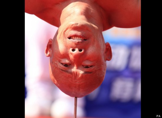 Ο 47χρονος, βάρους 66 κιλών κασκαντέρ κουνά ακόμα και τα χέρια του καθώς κάνει το κόλπο, πριν σκύψει κάτω μπροστά από το πλήθος για να δείξει
