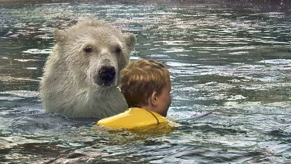 Κι όμως, οι φωτογραφίες που βλέπετε είναι πραγματικές και τα πλάνα αυτά είναι συνηθισμένα καθημερινά, αφού παιδιά και πολικές αρκούδες κολυμπούν μαζί στο πάρκο «Polar Bear Habitat» τον Καναδά, σε μια προσπάθεια των ιδιοκτητών να ευαισθητοποιήσουν τον κόσμο σχετικά με τη συμπεριφορά των εκπληκτικών αυτών ζώων.