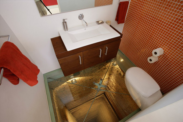 Το εν αχρηστία φρεάτιο του ανελκυστήρα μπορούσε να «μεταμορφωθεί» σε ένα εντυπωσιακό μπάνιο από γυαλί, δίνοντας τη δυνατότητα στο χρήστη να βλέπει προς τα κάτω ολόκληρο το ασανσέρ! Και έτσι ακριβώς έγινε.